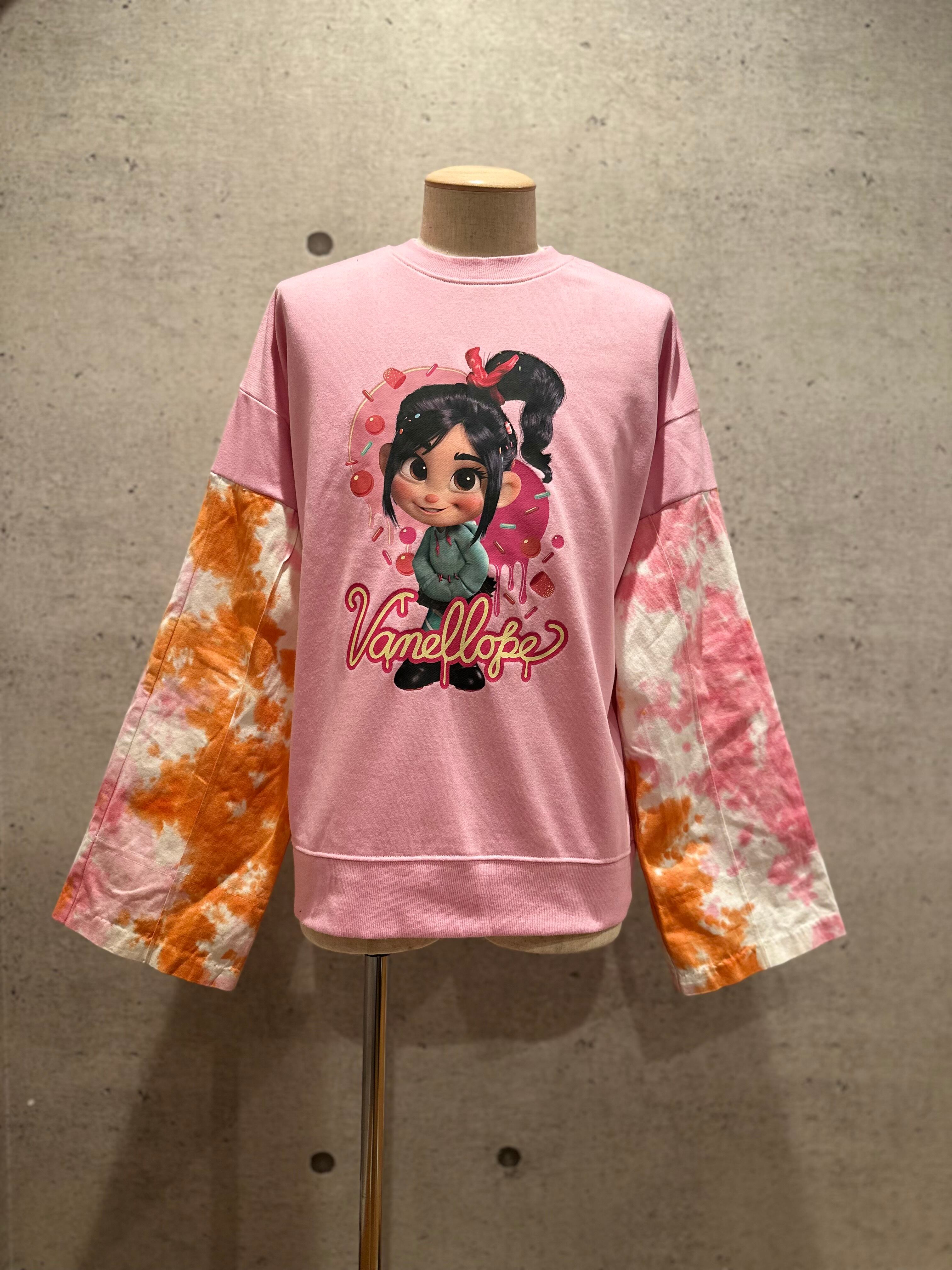 そんなヴァネロペの可愛さを全面に前面にプリントされたピンクボディにオレンジ色とピンク色のマーブル柄なデニムパンツをチョイス。