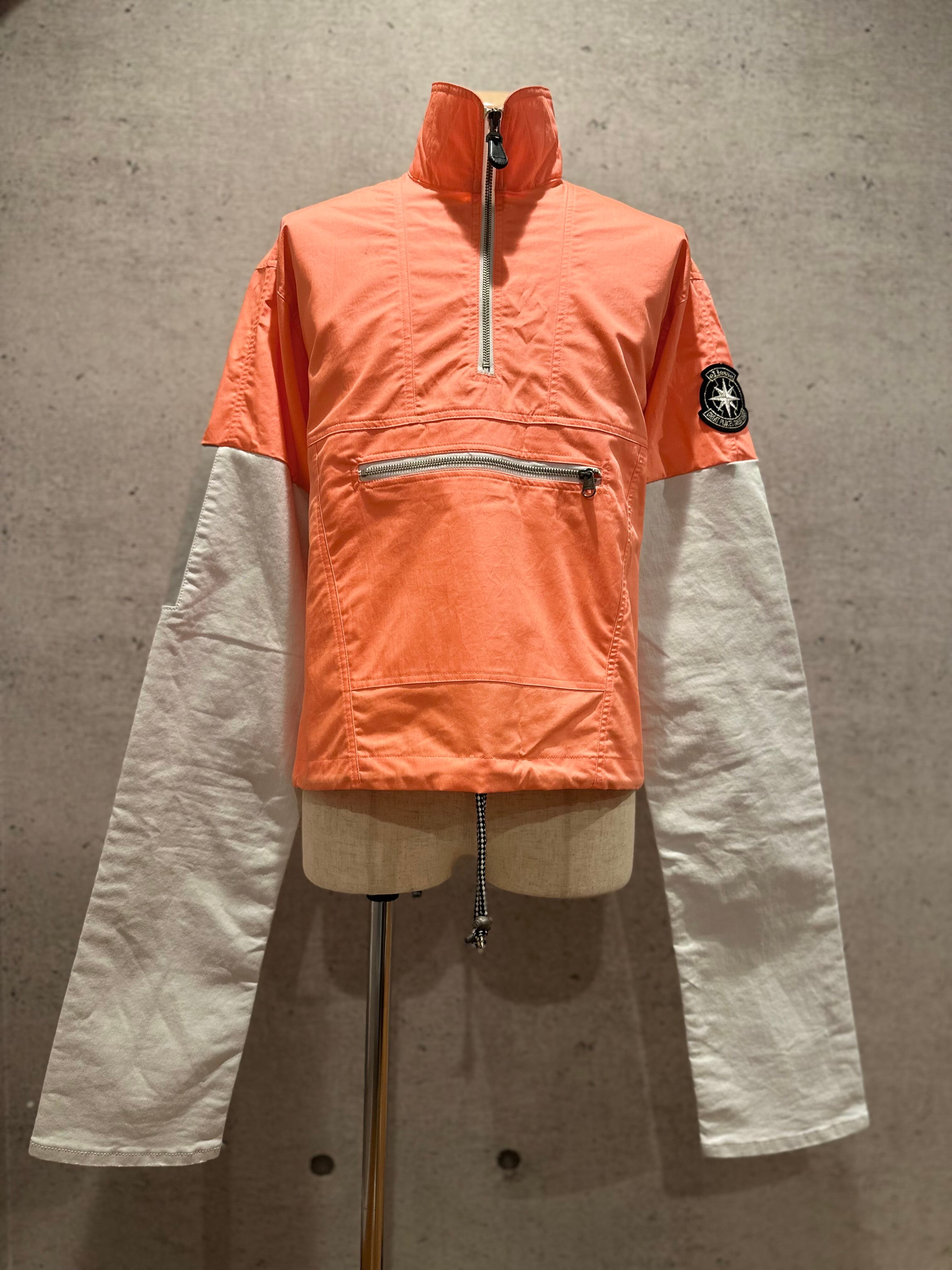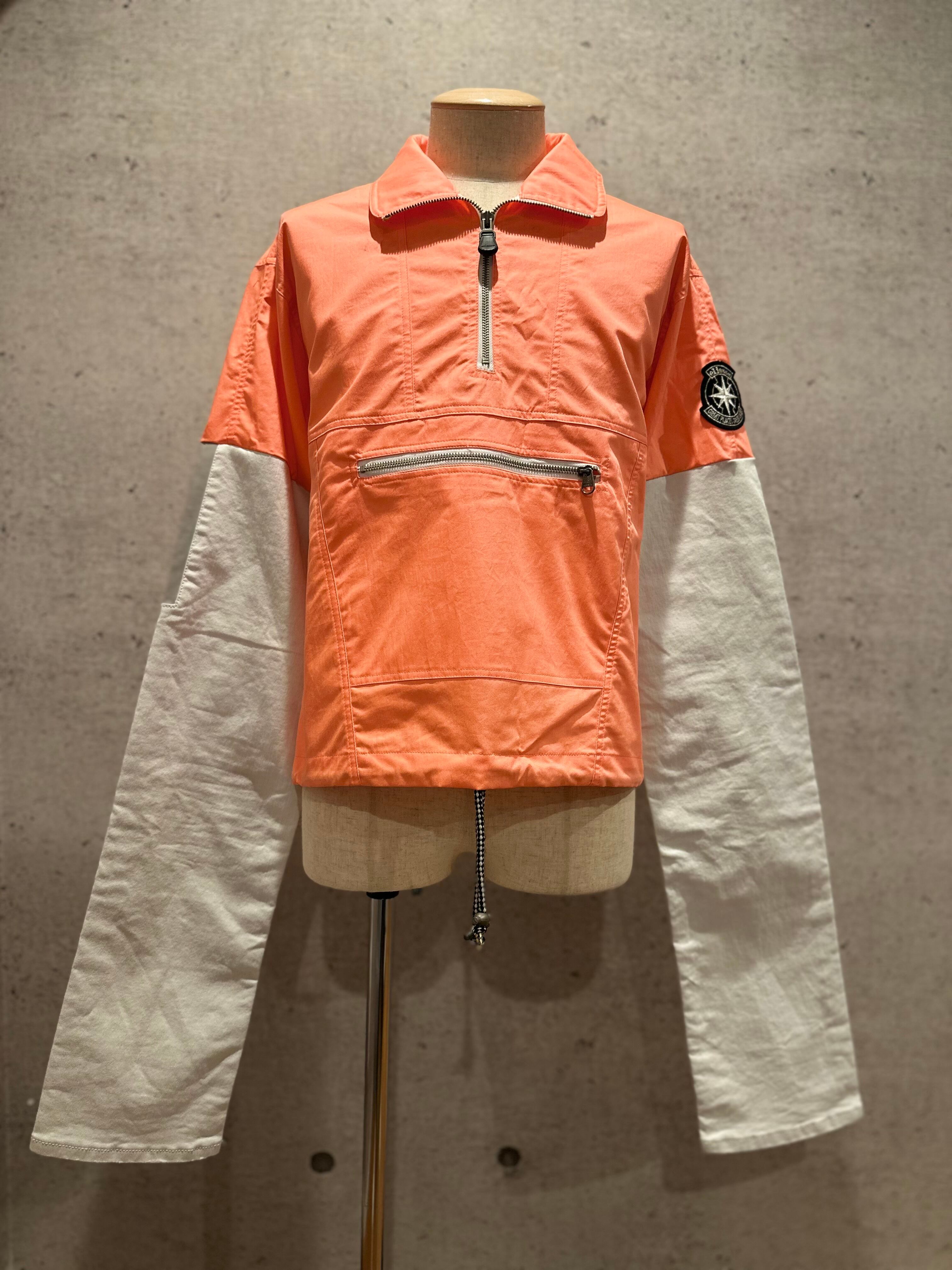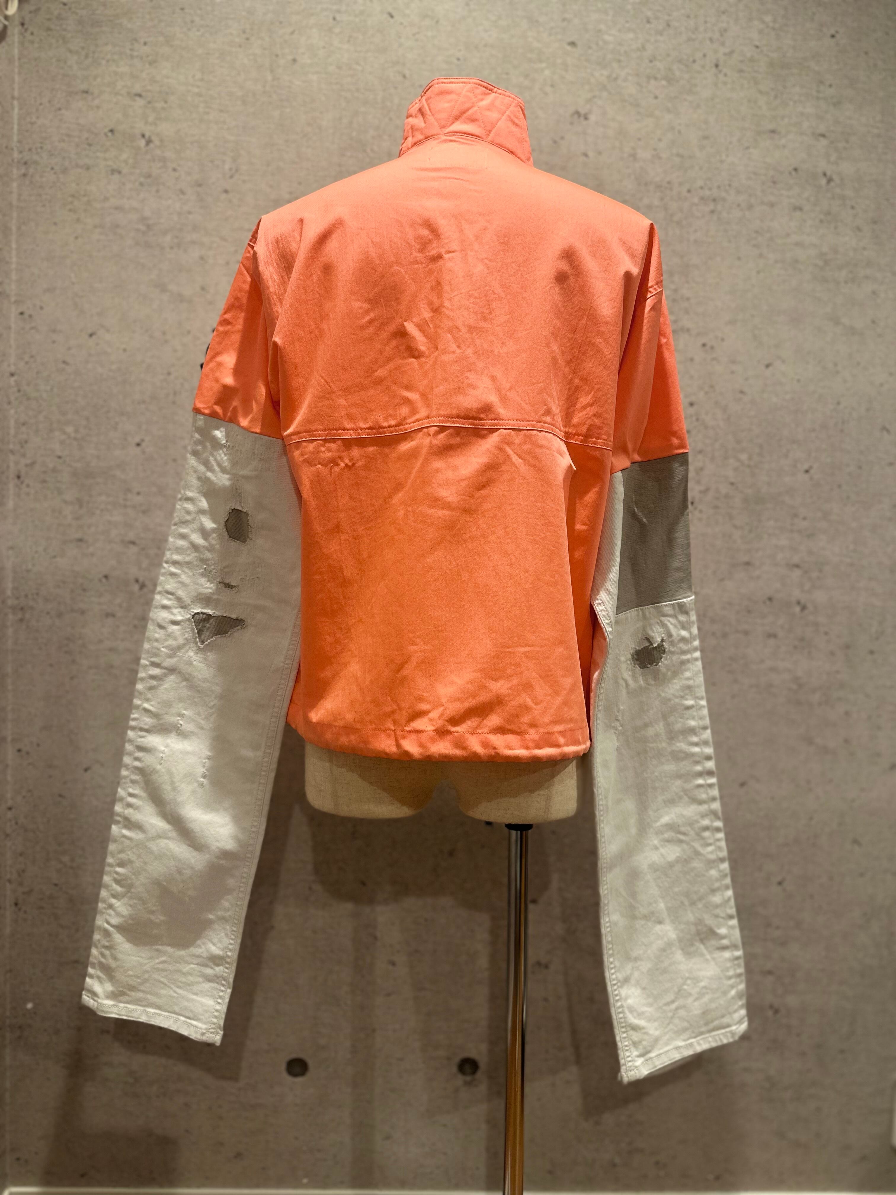 目を引く蛍光オレンジに対して白いデニムでワッペンの刺繍とチャック部分に用いられている小さな白色を拾うことでまとまりのある一着に。